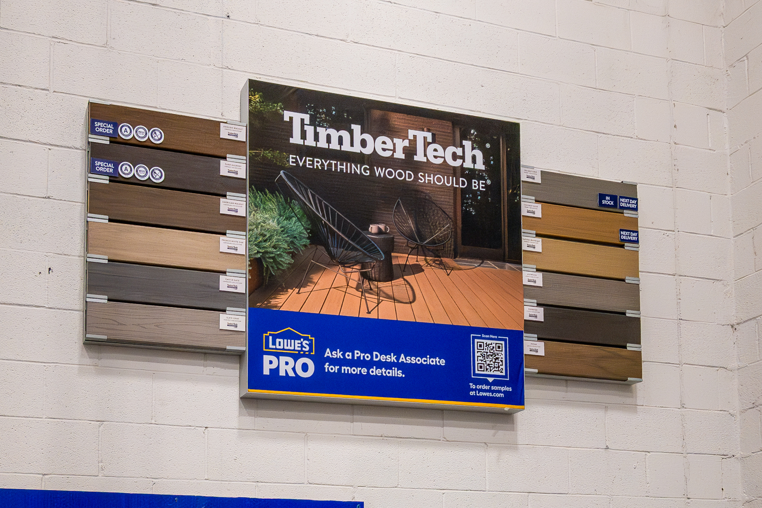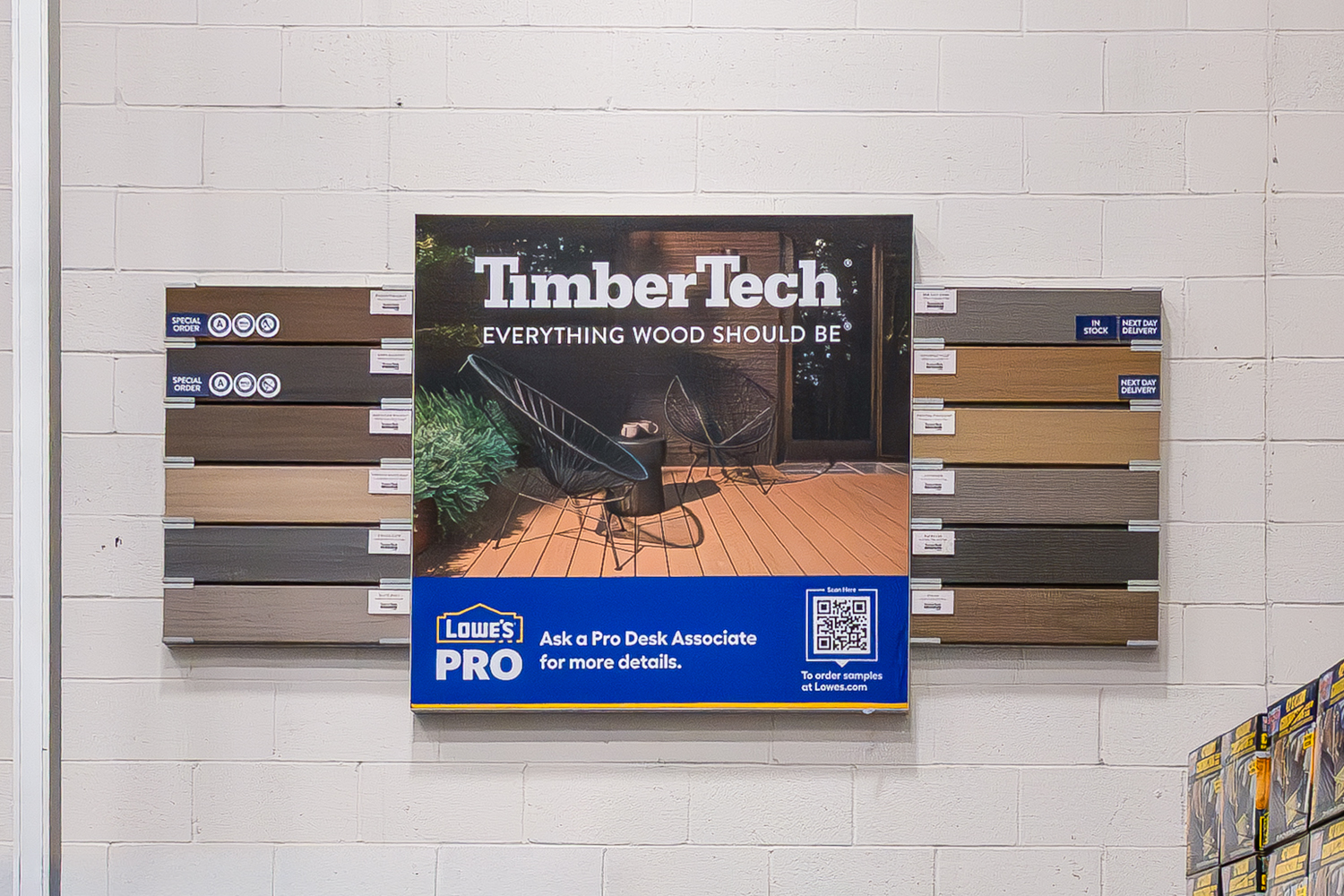 The AZEK Company partnered with SEG Systems® to elevate its TimberTech® decking and railing business unit’s brand presence at Lowe’s Pro Desks. AZEK and SEG collaborated to develop a custom retail product display engineered for both durability and impact in a fast-moving retail environment. Designed to showcase decking samples in a clean, organized format, the display helps contractors quickly evaluate options and reinforces TimberTech’s premium positioning right where buying decisions happen.